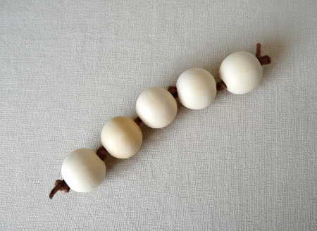 Montessori grasping beads are a simple tactile material made from several large wooden beads strung on a cord. Traditionally, the beads are made of natural wood and threaded on a leather or hemp cord.
