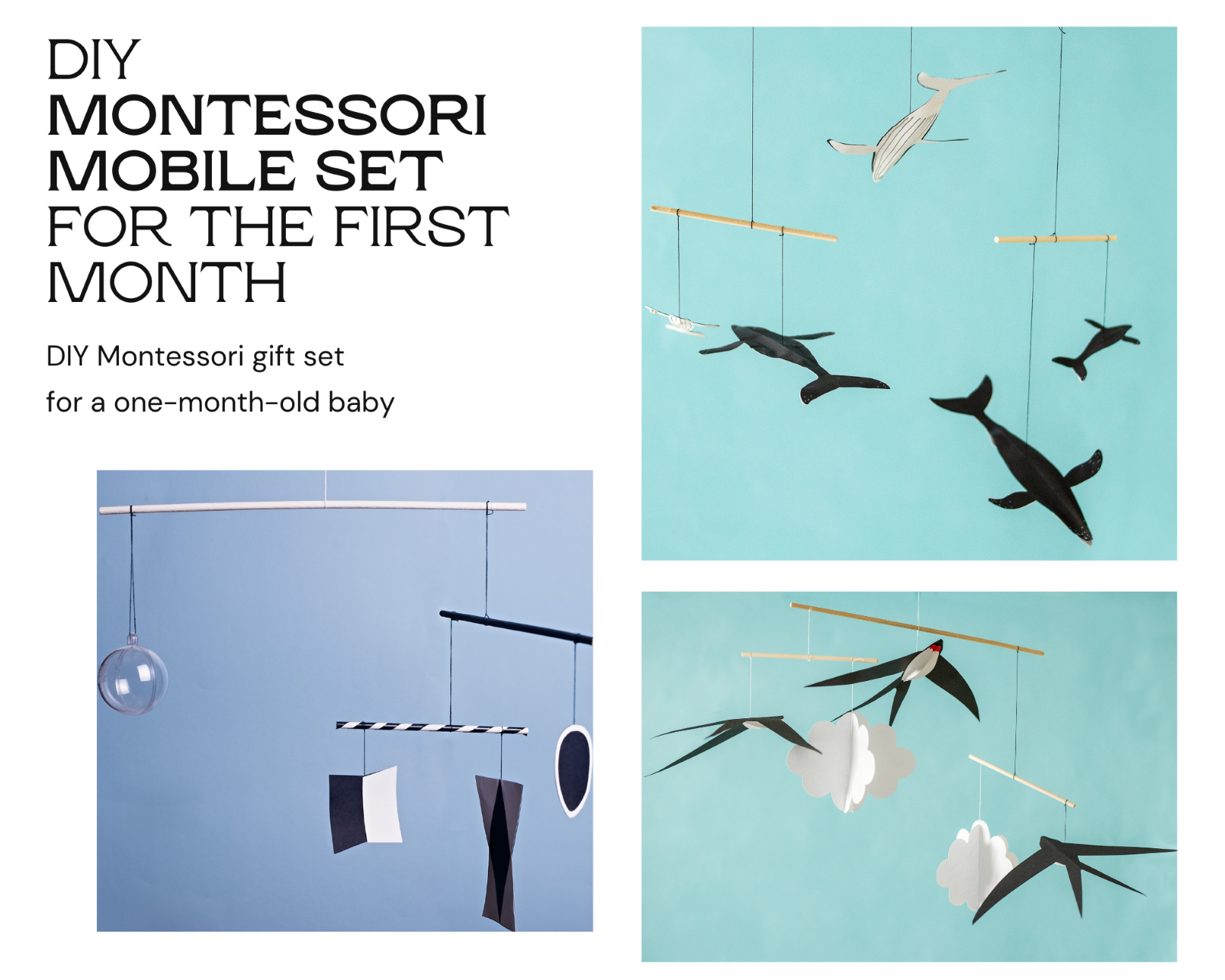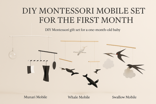 The DIY Newborn Mobile Set is a Montessori baby mobile designed for visual stimulation and sensory development. Featuring high-contrast black and white designs, this set includes the Munari, Whale, and Swallow mobiles, all made from natural, eco-friendly materials. Easy to assemble and perfect for a DIY nursery, it provides a calming yet engaging experience for newborns. A beautiful, educational Montessori gift for new parents!